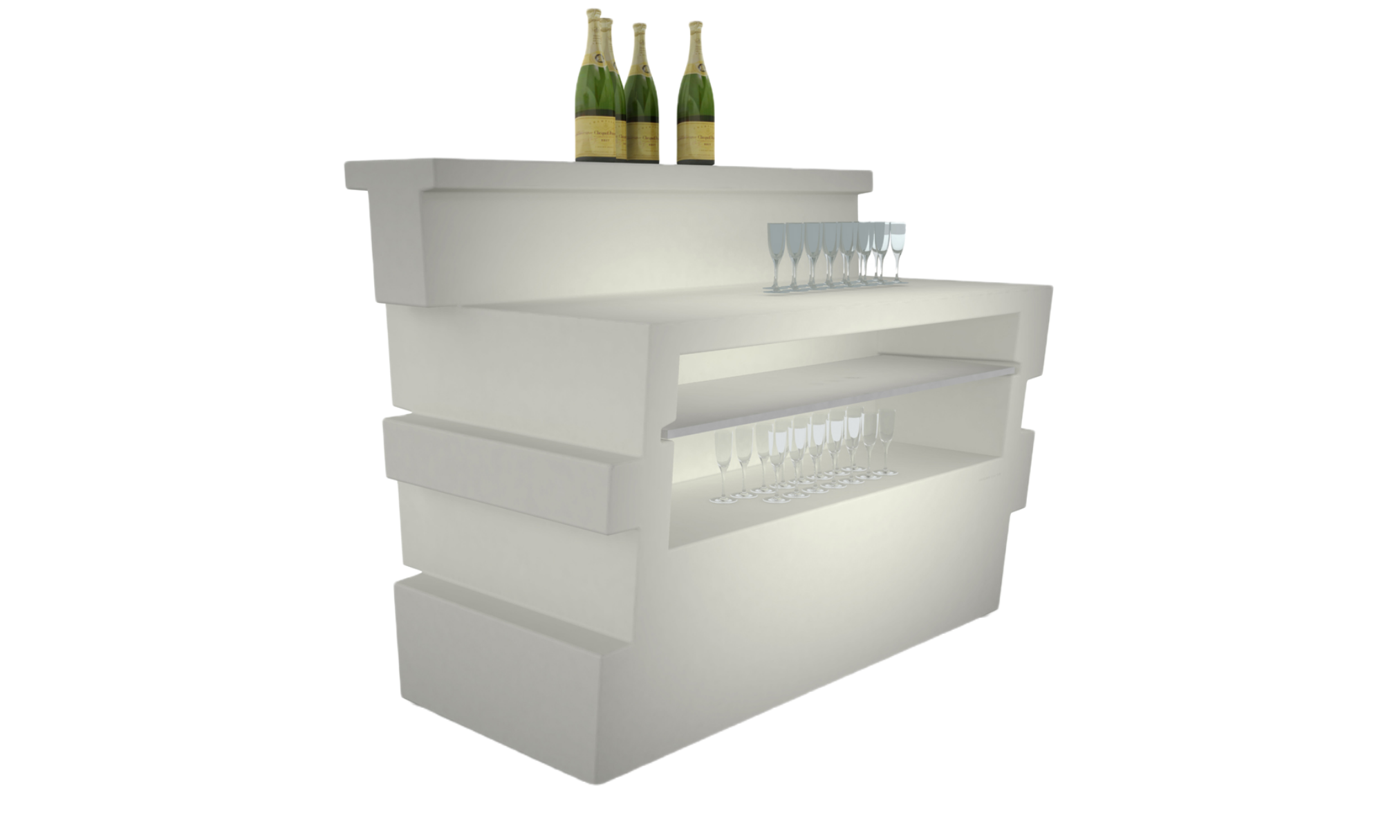 This aspect makes the bar counter functional for different types of use. it can be installed both indoors and outdoors. Tetris is resistant to shocks and atmospheric agents. In white polyethylene it is also possible to provide a work and service top in satin stainless steel, resistant, hygienic and easy to maintain. It is also available in a luminous version which, thanks to the neutral color of the polyethylene, makes the counter scenographic, destined to become an element of effect and ambiance. Tetris is an eco-sustainable product that is suitable for professional but also residential use.