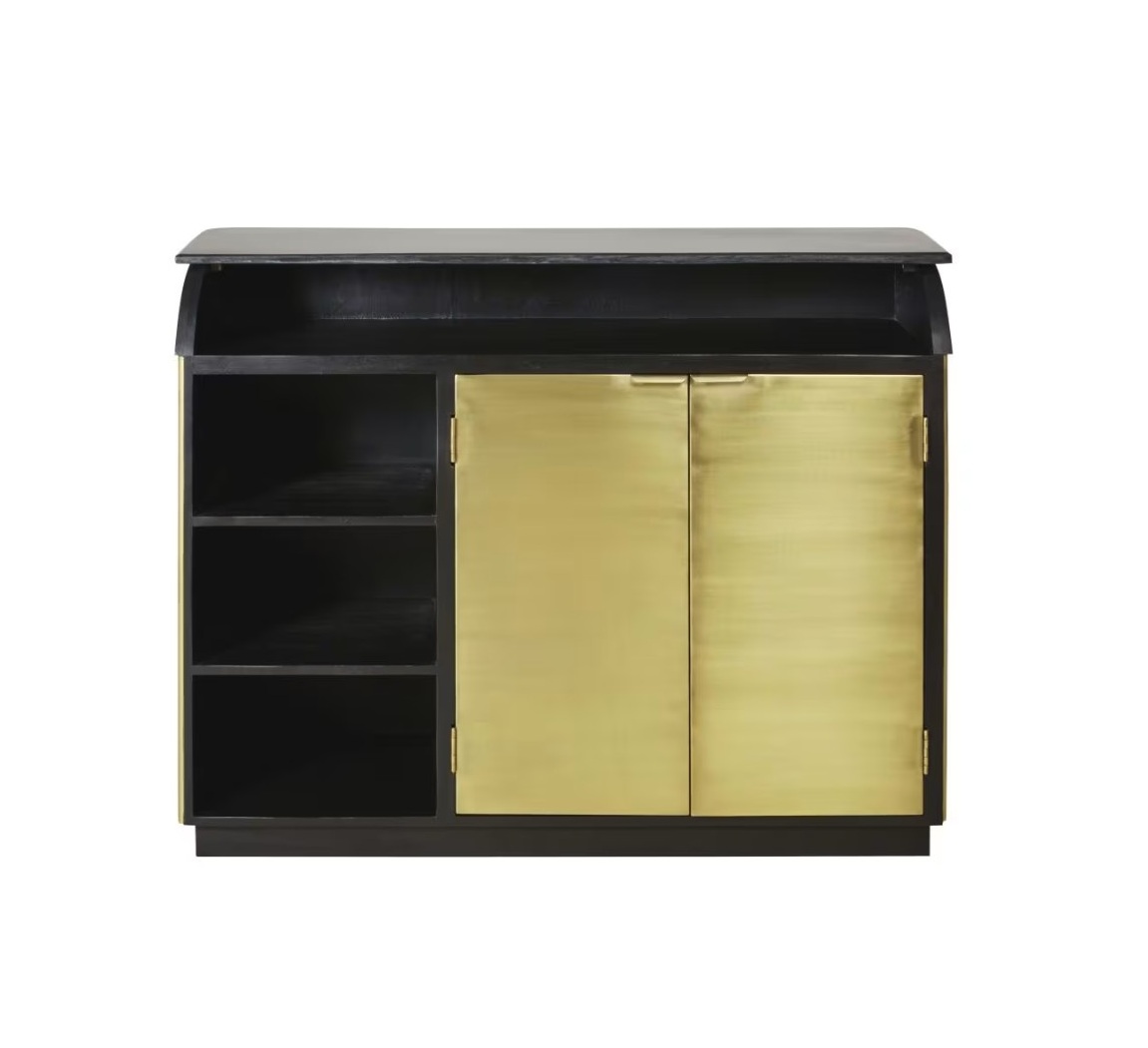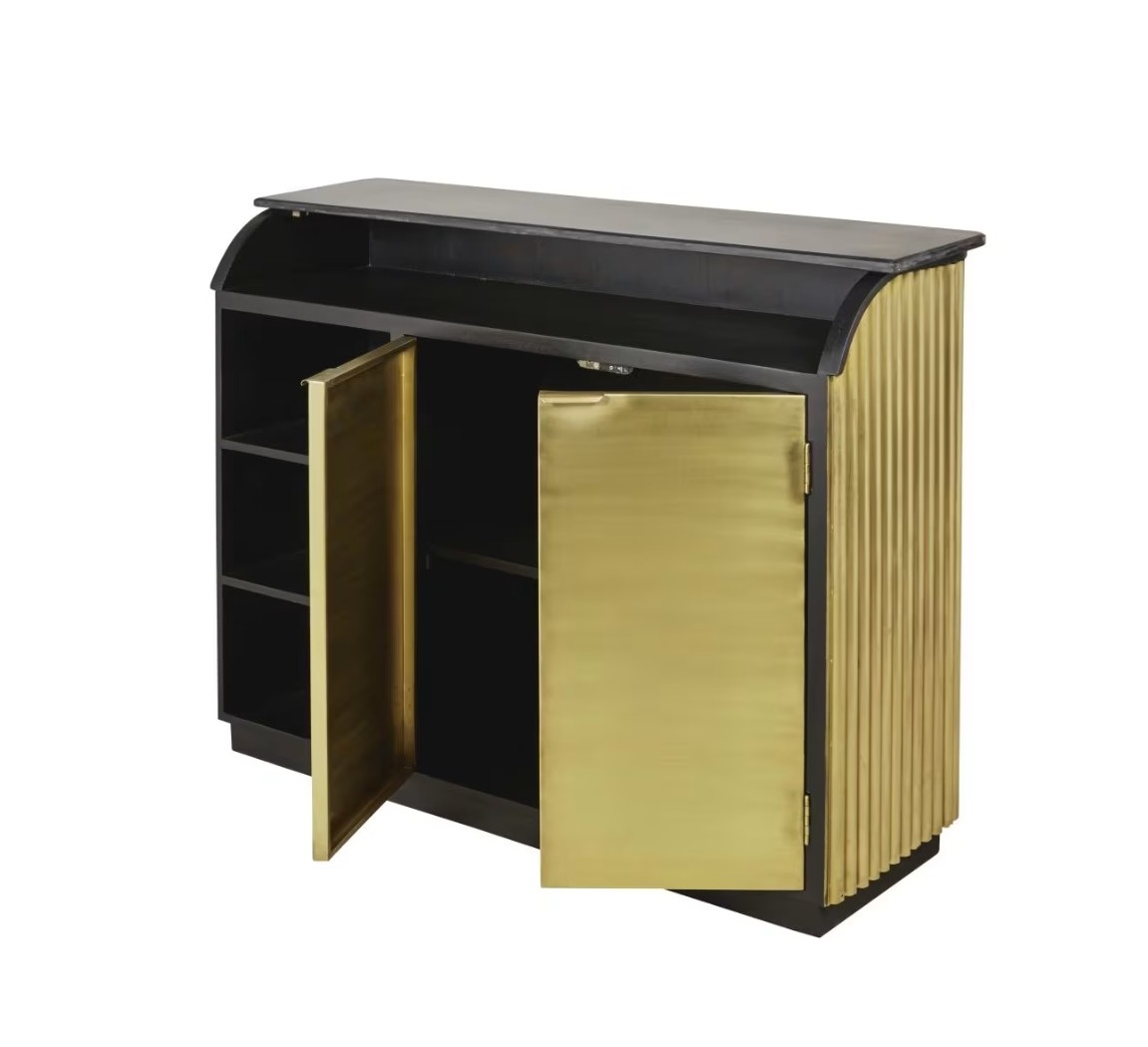 Cuzco Gold is a corrugated metal bar counter in brass and black stone . A black mango wood structure, 2 brass-colored galvanized metal doors and a black marble top complete this Bar –  counter . For storage, 3 fixed wood shelves.