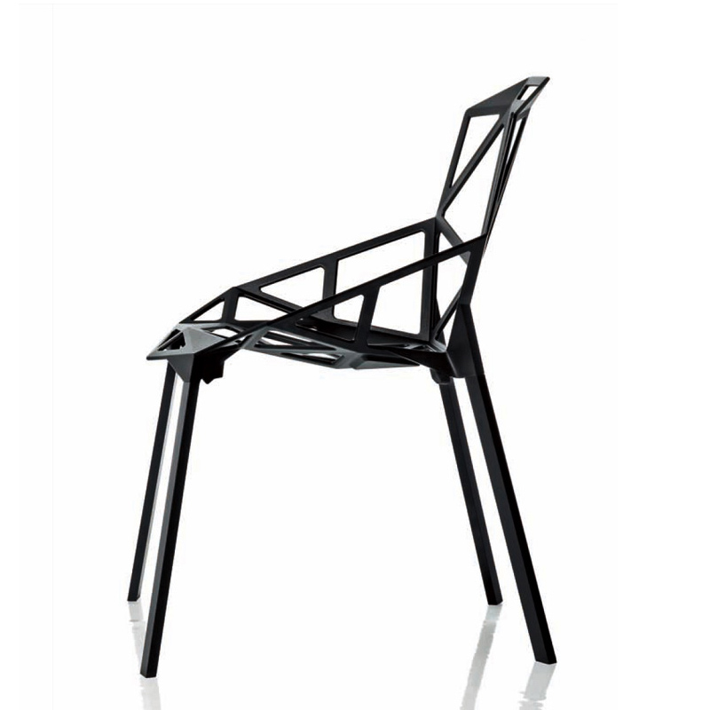 Chair One is by no means a mere avant-garde piece of furniture. The chair is an interaction of material, design and industrial production. It is rust-proof and fire-retardant and therefore predestined for fire-sensitive zones and for outdoor use. Grcic used die cast aluminium for the first time on the entire seat surface additionally treating it with sputtered fluoridated titanium and painting it in polyester powder.